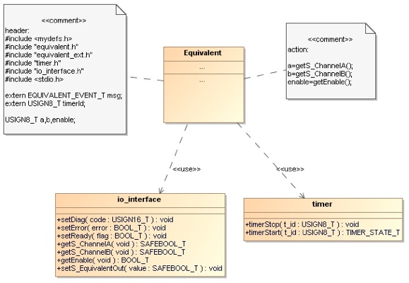 The class diagram below shows how the sample implementation is designed. The class io_interface provides a hardware abstraction layer to the inputs and outputs required by the function block. The timer class provides general timer functions. Please note that it is only good enough to test the state machine. Classes are realized as C/H-Files. The class diagram shows two comments using the action and header keywords which are supported from the code generator. C-code in the „action comment“ is copied into the C-file just before the state-chart code. The listed C-code reads and stores the function block inputs in local variables for faster processing. These variables as well as some required headers etc. are defined in the other comment. Code following the header keyword is simply copied to the beginning of the generated C-file.
