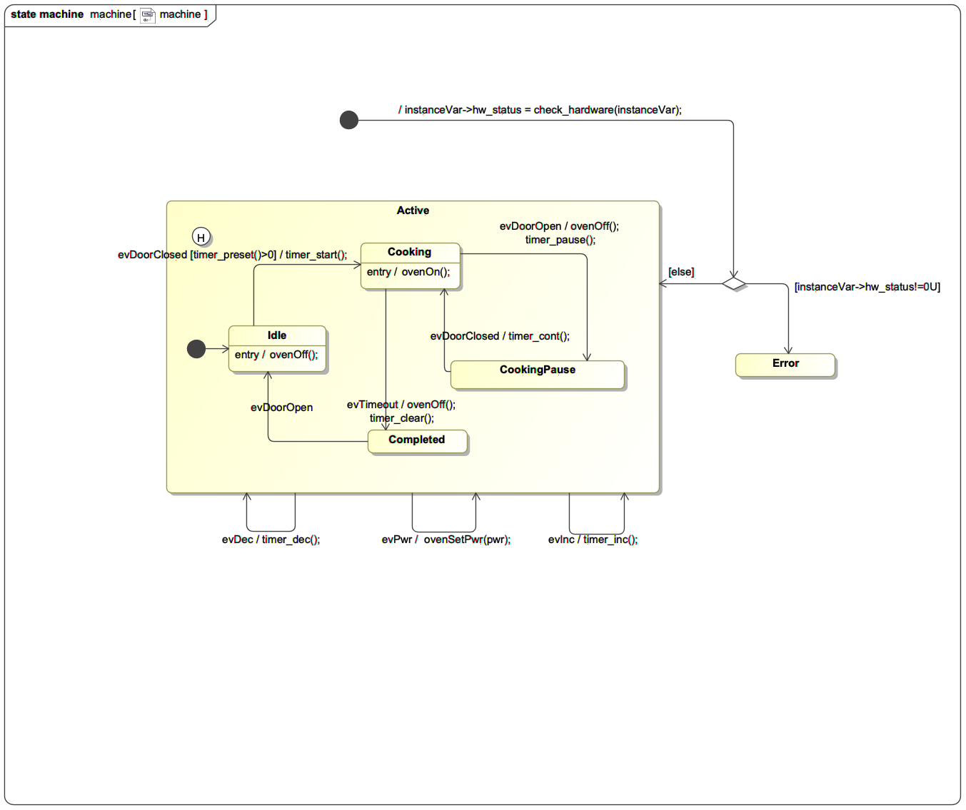 State machine of a simple microwave oven  Class that contains the state machine