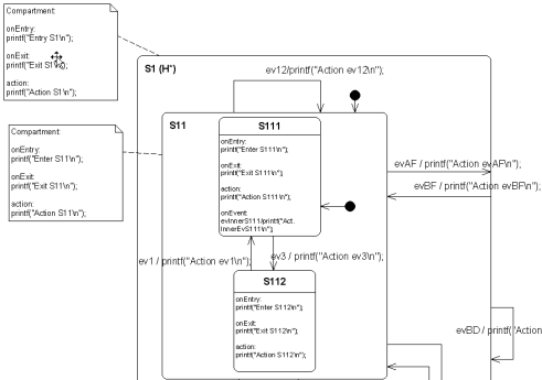 - Tree / graphics relation. Clicking on a state in the state tree shows the related diagram. Clicing on a state in a diagram shows the state in the state tree.
