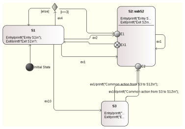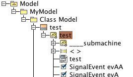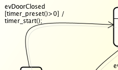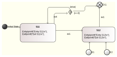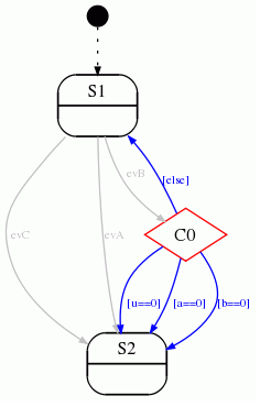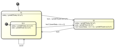 - Simulation of a state machine with regions: Presently events with guards are sent to the simulation engine as string. Based on that input the simulator finds the transition to go and changes state accordingly. In machines with regions it might happen that in one region an event (e.g. $ev1$) has guard $[i==2]$ and in another region $[i>=0]$. To simulate the event $ev1$ with guard condition $i==2$ means that both events must trigger a transition but it is only possible to send exactly one event/guard statement – e.g. $ev1[i>0]$ – to the simulator. This means a state change happens only in one region – which is not correct and does not reflect what actually happens in the generated code! To overcome this problem, it would be necessary to understand the semantics of the guard condition, which would be a major task and is not planned yet.