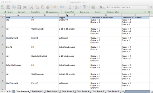 -c or -c1 | Print transition coverage information and creates an Excel sheet with test routes. See section 3.19 for more information. -c uses a depth-first tree search algorithm which produces fewer but longer test routes. -c1 uses a breadth first algorithm which creates more but shorter test routes. |