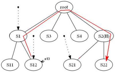 Basically a state machine can be represented as a tree of states. A transition e13 connects the two states S12 and S22. If the transition is triggered you have to walk upwards in the tree starting from S12 until you reach a common parent of S12 and S22. Then walk downwards in the tree until the target state (in this case S22) is reached. On the way all the entry and exit code of the visited states has to be executed.