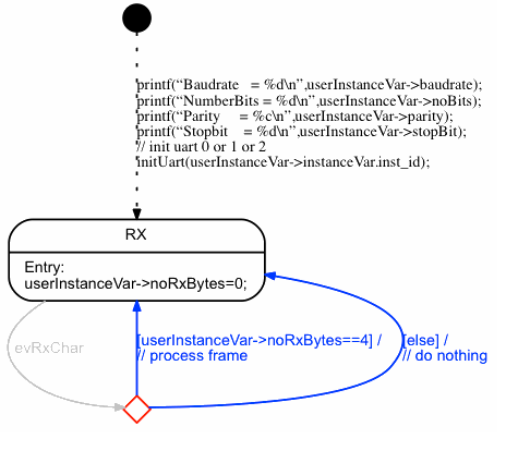 Coming back now to the example of three serial interfaces. The following figure shows a simplified state machine for handling a serial interface. The state machine is generic. Whether COM0 or COM1 or COM2 is processed is determined only from the content of the instance variable. And also other parameters are stored there and of course the local machine variables.