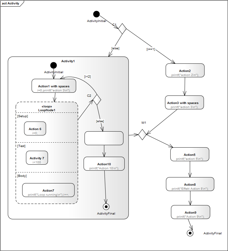 The following activity diagram shows some examples where actions can be combined. This is the unnamed action and Action10 in the sub-activity Activity1. As well as Action2 with Action 3 with spaces and Action5 to Action9. The generated code for the latter looks as follows. The new action has a generated name but the comment clearly indicates which actions were the basis for the new action.