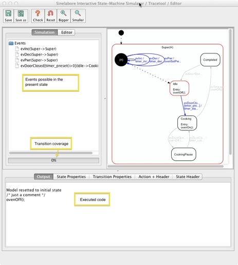 he main window shows the automatically generated state diagram. Events that can be handled at that moment are shown in blue. They are also listed in left tree view. The output field on the bottom of the window shows the so far executed action code.