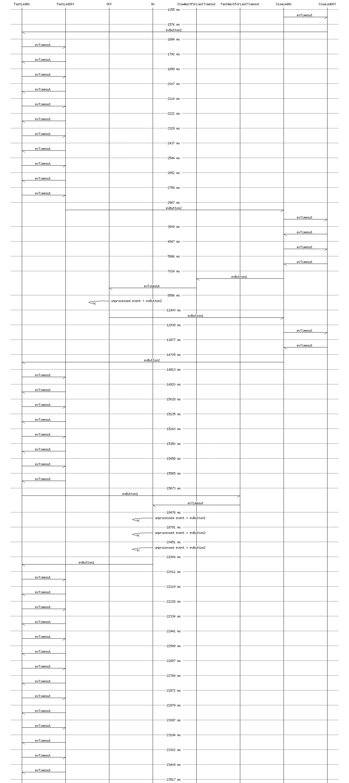 switch (stateVars.stateVar) { case Slow: switch (stateVars.stateVarSlow) { case SlowLedOn: if(msg==evTimeout){ /* Transition from SlowLedOn to SlowLedOff */ evConsumed=1; /* OnEntry code of state SlowLedOff */ digitalWrite(RED_LED, LOW); /* adjust state variables */ stateVarsCopy.stateVarSlow = SlowLedOff; ---> StatemachineTraceEvent(0); <---- }else{ /* Intentionally left blank */ } /*end of event selection */ break; /* end of case SlowLedOn */