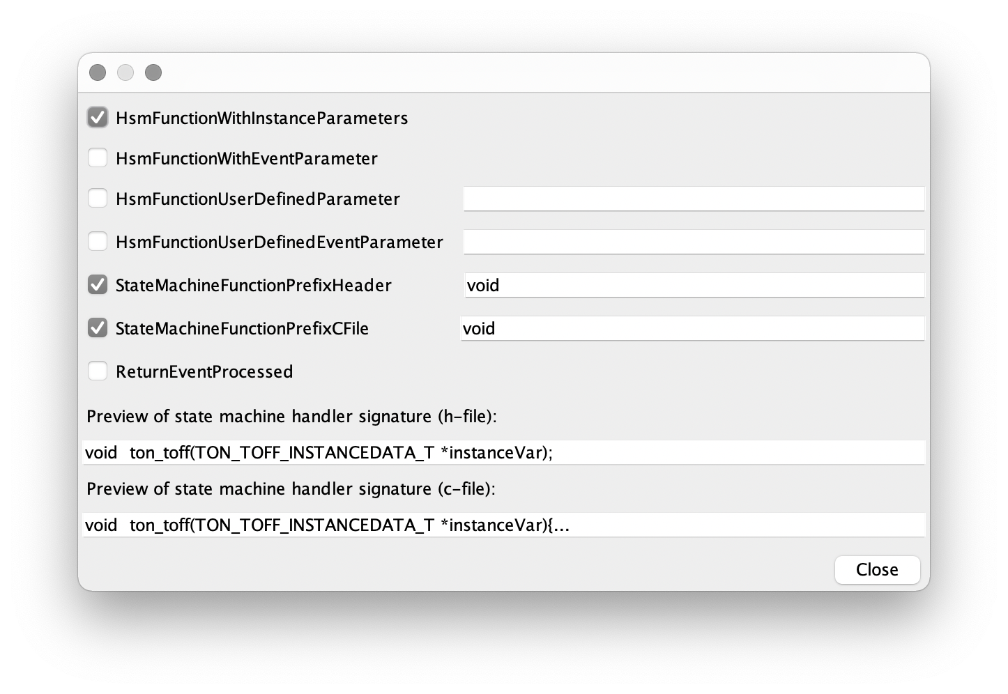 Bugfix in the C++ backend. Relevant for users who have state machines with regions and do not want event handler parameters. With previous version a msg parameter of the region code was generated. In the previous version, a msg parameter was incorrectly generated for the region handler code. This has now been corrected.