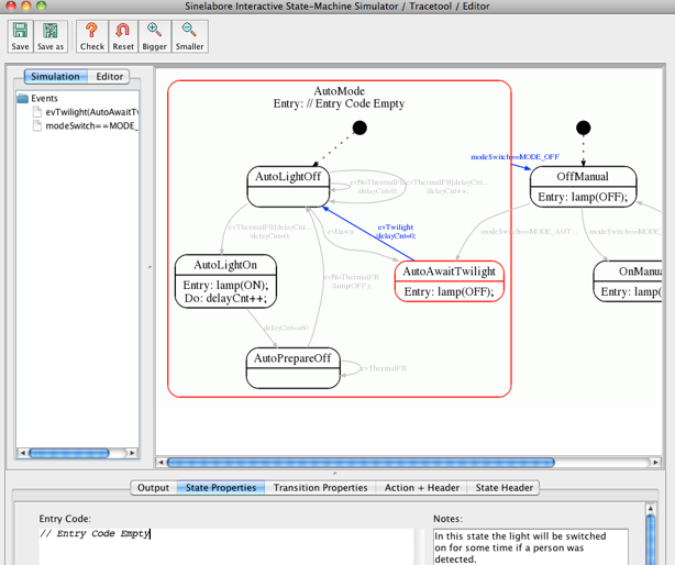 The sinelaboreRT codegen tool is able to display state diagrams based on an automatic layout engine. In simulation mode trace data can be received via a UDP connection. The received evens are then used to trigger the same state changes as in the compiled C program. This makes it possible to follow the state changes of the light.exe program while we stimulate it with the keyboard events.