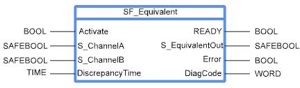 According to the PLCopen specification this function block converts two equivalent SAFEBOOL inputs to one SAFEBOOL output with discrepancy time monitoring. If one channel signal changes from TRUE to FALSE the output immediately switches off (FALSE) for safety reasons. Discrepancy time monitoring: The discrepancy time is the maximum period during which both inputs may have different states without the function block detecting an error. Discrepancy time monitoring starts when the status of an input changes. The function block detects an error when both inputs do not have the same status once the discrepancy time has elapsed.