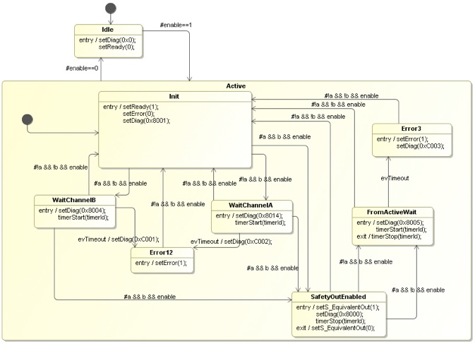 The PLCOpen organization has defined a set of standard function blocks (FB) for safety-related functionality. The function block specifications are given as state diagrams. The example presented here realizes the equivalent function block.