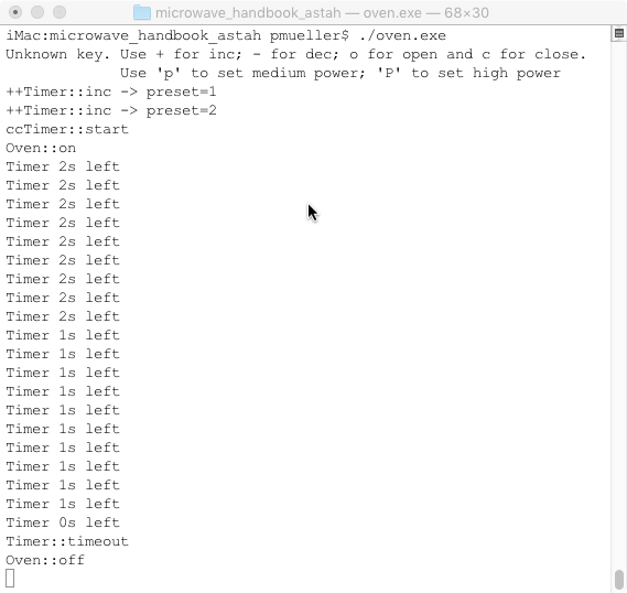 This example shows several UML state machine elements that make up a state machine. It is enough to generate production ready code out of it. Please note that the design presented here is not the only possible solution for the given requirements. Also some functions of a real microwave oven – e.g. control of a lamp in the oven – are still missing.