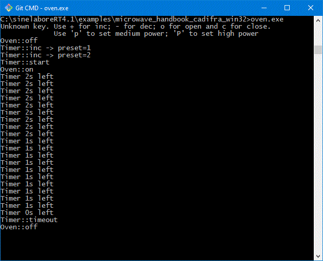 mingw32-make java -cp "../../bin/*" codegen.Main -p CADIFRA -p Cadifra -l cx -doxygen -o oven first_example_step3.cdd Create inline doxygen of state machine function A linked note starts not with 'Compartment' and is therefore ignored Starting robustness tests of state machine ... State names: .............. Machine hierarchy: ........ Machine height = 2 Transitions: .............. Default states: ........... Final states: ............. Choices: .................. No. of children in composites: ... Connectivity of states: ... M1054: State Error has no outgoing transitions which indicates a dead end -> check your design. Can't find the License.txt file or invalid file. Codegen is running in demo mode Expected license file location: ../../bin/License.txt Running in demo mode! gcc -Wall -g main.c -c -o main.o gcc -Wall -g oven_hlp.c -c -o oven_hlp.o gcc -Wall -g oven.c -c -o oven.o gcc -o oven main.o oven_hlp.o oven.o C:\sinelaboreRT4.1\examples\microwave_handbook_cadifra_win32>