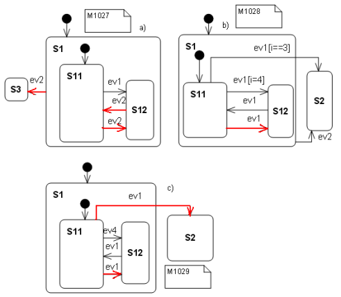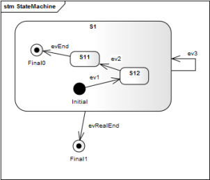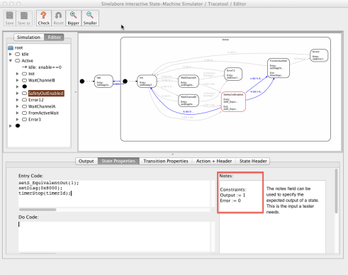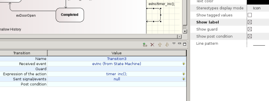 - Simulation of a state machine with regions: Presently events with guards are sent to the simulation engine as string. Based on that input the simulator finds the transition to go and changes state accordingly. In machines with regions it might happen that in one region an event (e.g. $ev1$) has guard $[i==2]$ and in another region $[i>=0]$. To simulate the event $ev1$ with guard condition $i==2$ means that both events must trigger a transition but it is only possible to send exactly one event/guard statement – e.g. $ev1[i>0]$ – to the simulator. This means a state change happens only in one region – which is not correct and does not reflect what actually happens in the generated code! To overcome this problem, it would be necessary to understand the semantics of the guard condition, which would be a major task and is not planned yet.
