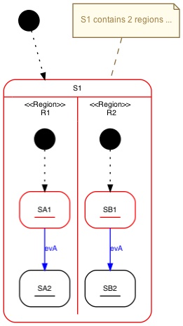 - Transitions must not cross region boundaries: In the next figure state transitions do not cross region boundaries and therefore the modellers’ intention is clear. But look at the next diagram. Now it is not clear anymore what the modeller had in mind. And it is also not very obvious what a code generator should generate. For that reason the following constraints were defined.