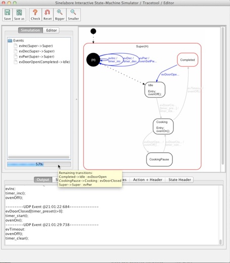 The transitions not yet taken can be displayed as tooltip of the progress bar. As you can see we have not yet changed the cooking power nor have we opened the door while cooking.